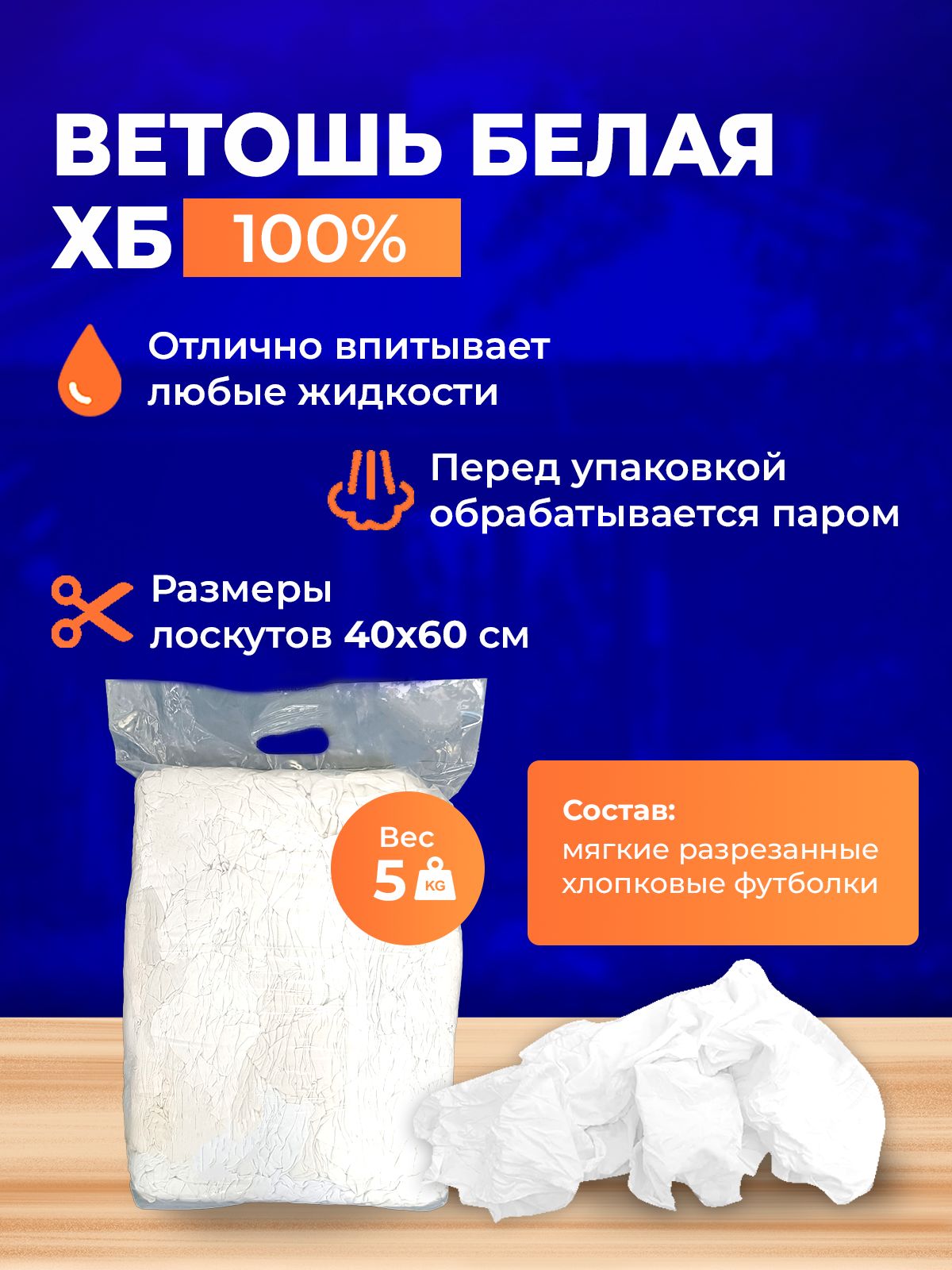Перед упаковкой ветошь подвергается обработке паром, что гарантирует её чистоту. Это делает материал безопасным для использования в различных сферах, включая промышленные предприятия и производственные цеха.